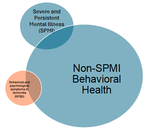 Behavioral health conditions affect a wide range of people with serious illness and may present in various forms. Many individuals may have experienced longstanding serious and persistent mental illness (SPMI) such as schizophrenia, bipolar disorder, or severe depression prior to developing a serious physical illness. Others may develop depression, anxiety, or substance use disorders as a result of the challenges and losses associated with living with serious illness. Still others, especially individuals with dementia, may experience behavioral and psychological symptoms that may resemble mental illness and complicate disease management and quality of life. These categories are not mutually exclusive and often overlap, creating complex care needs that cut across traditional medical and behavioral health boundaries.